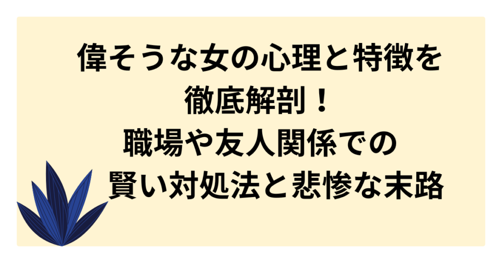 職場やプライベートにいる「偉そうな女」にイライラしていませんか? 本記事では、上から目線な女性に共通する性格や行動、口癖を徹底分析。その裏にある意外な心理やコンプレックス、ストレスを溜めない対処法、そして彼女たちが迎える孤独な末路までを詳... -