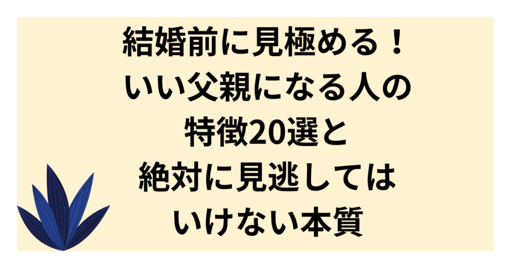 結婚後に「こんなはずじゃなかった」と後悔しないために。 いい父親になる男性には明確な共通点があります。 性格、行動パターン、育ち方など、交際中に見極めるべきポイントを徹底解説。家事育児への姿勢や、本当に家族を大切にする男性の心理まで、幸せ... -