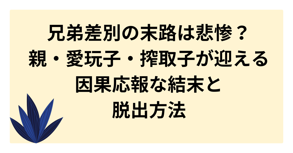 本記事では、兄弟差別がもたらす残酷な結末を、差別された側(搾取子)、差別した側(愛玩子)、そして元凶である親の3つの視点から徹底的に解剖します。
