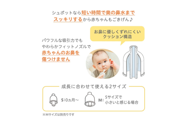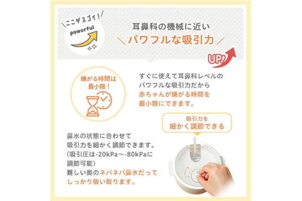 新生児のデリケートな鼻には優しく、幼児のしつこい鼻水には力強く。